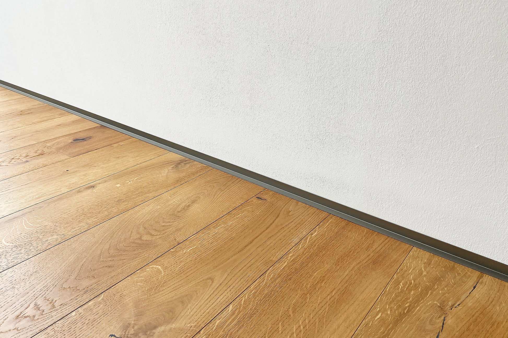 Das Sockelprofil SL16X5 stellt einen dezenten und innovativen Abschluss von Bodenbelag zu Wand, Fenster(rahmen) oder Treppenstufe her – dort, wo Anschluss- und Dehnfugen bautechnisch eingehalten werden müssen.