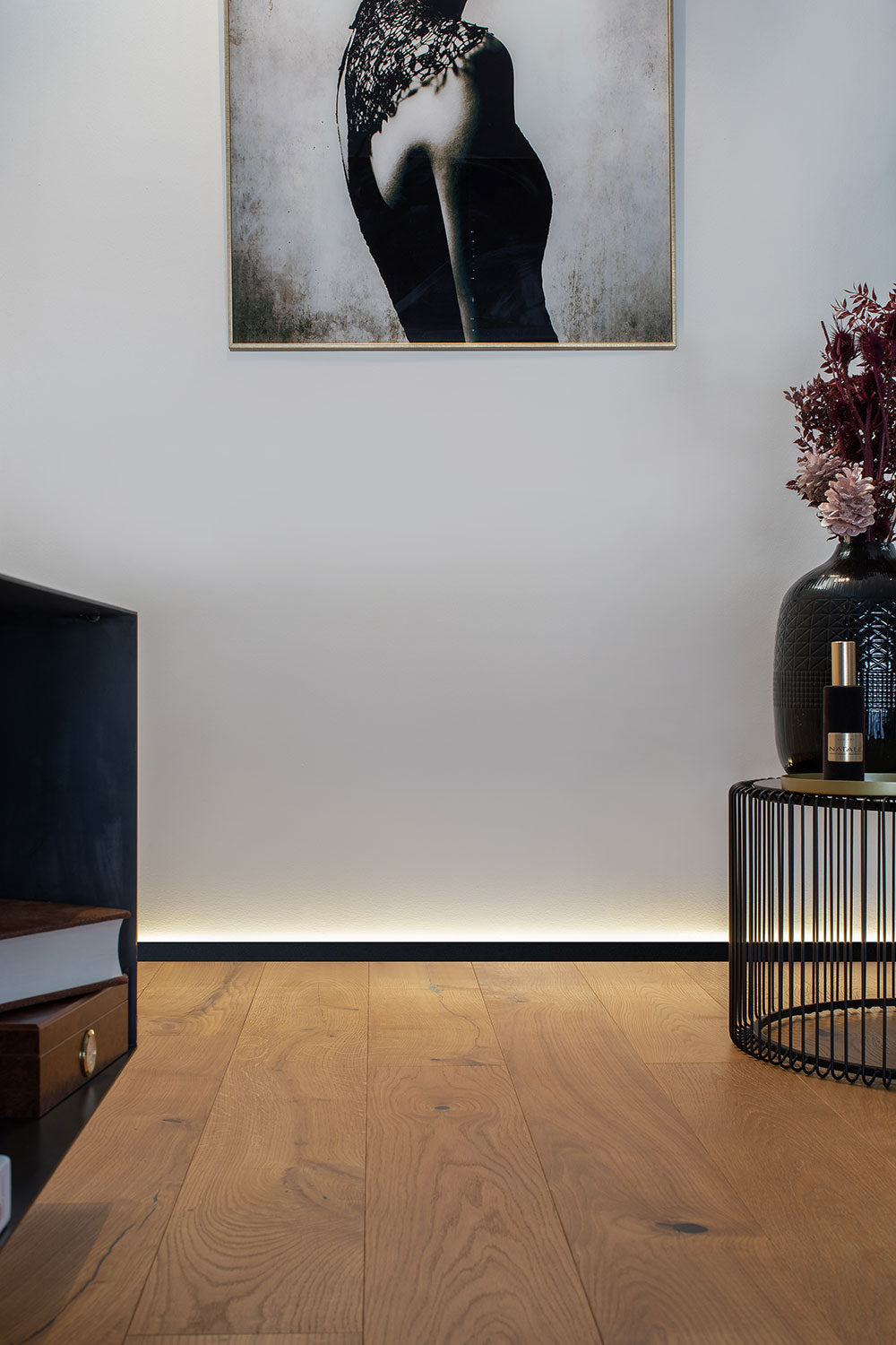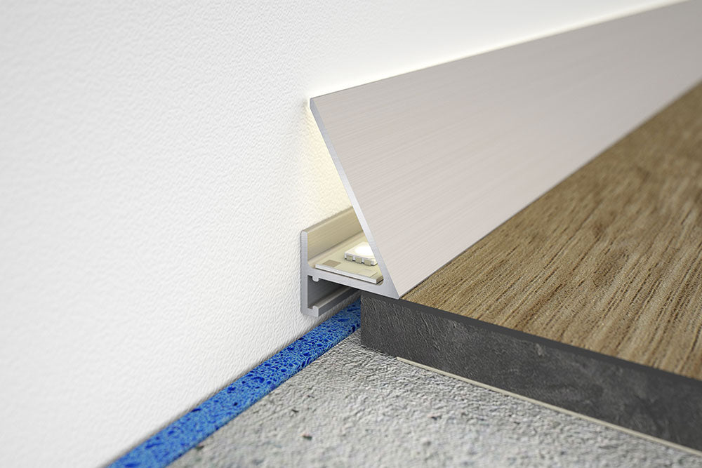 Das Sockelprofil SLED16X5 stellt einen dezenten und innovativen Abschluss von Bodenbelag zu Wand, Fenster(rahmen) oder Treppenstufe her - dort, wo Anschluss- und Dehnfugen bautechnisch eingehalten werden müssen.